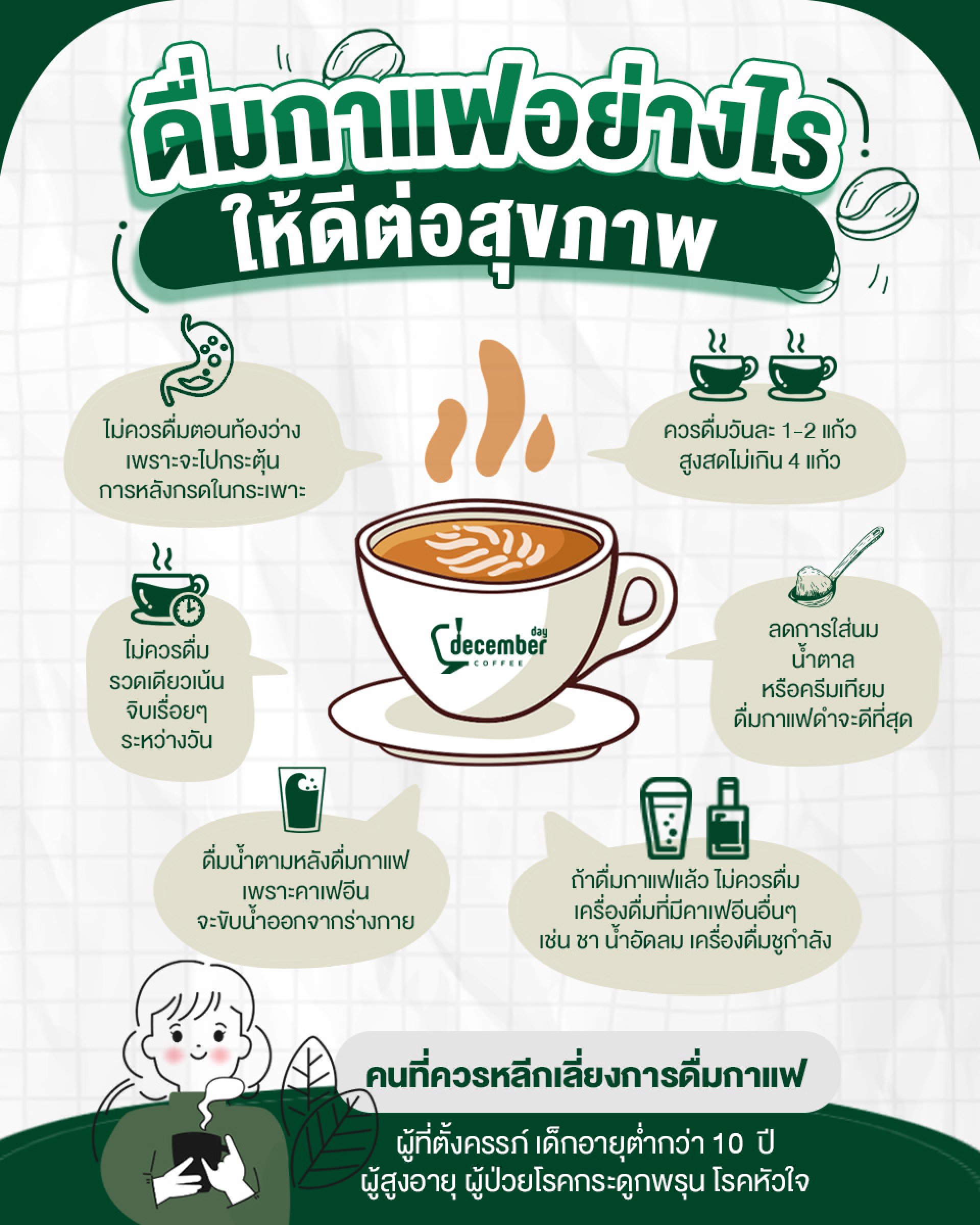 ด้วยความห่วงใยจาก December Day Coffee เราใส่ใจทุกแก้วของคุณ ตั้งแต่เครื่องชง เมล็ดกาแฟ ไปจนถึงสุขภาพของคนดื่ม!