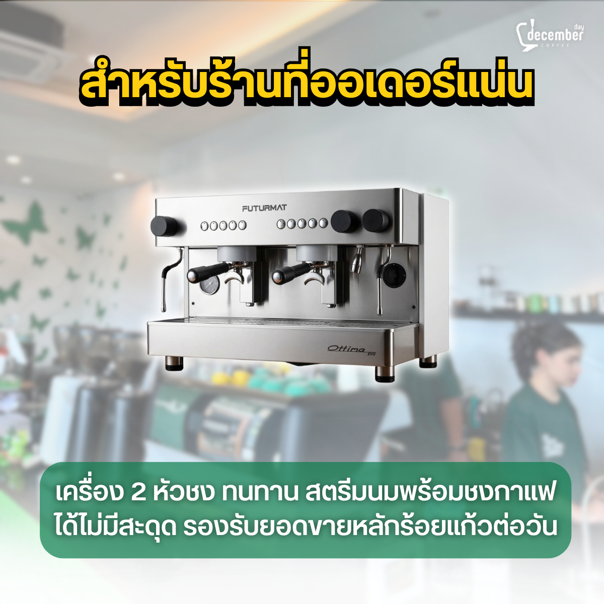 สำหรับร้านที่ออเดอร์แน่น หากคุณตั้งเป้าหมายยอดขายหลักร้อยแก้วต่อวัน การขยับมาใช้เครื่องชง 2 หัวกรุ๊ป อย่าง Futurmat Ottima Evo คือคำตอบที่ใช่ เพราะมีความทนทานสูง สามารถสตรีมนมพร้อมกับชงกาแฟไปได้พร้อมๆ กันแบบไม่มีสะดุด รองรับลูกค้าในช่วงเวลาเร่งด่วน (Rush Hour) ได้อย่างสบายๆ