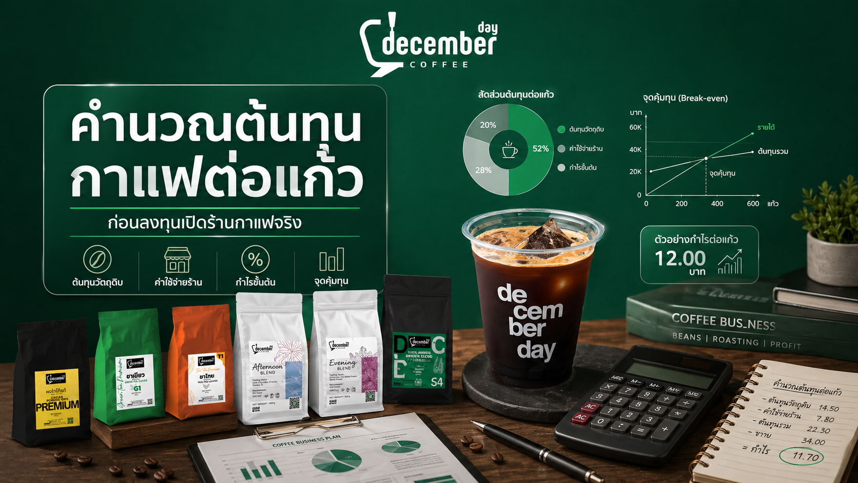 การคำนวณต้นทุนกาแฟต่อแก้วเป็นขั้นตอนสำคัญสำหรับคนที่กำลังวางแผนเปิดร้านกาแฟ เพราะช่วยให้รู้ว่ากาแฟ 1 แก้วมีต้นทุนจริงเท่าไหร่ ควรตั้งราคาขายเท่าไหร่ ต้องขายกี่แก้วต่อวันถึงจะถึงจุดคุ้มทุนร้านกาแฟ และควรเลือกเครื่องชงกาแฟสำหรับร้านแบบไหนให้เหมาะกับงบลงทุน บทความนี้ Decemberday Coffee จะพาคุณคำนวณต้นทุนร้านกาแฟ กำไรต่อแก้ว และจุดคุ้มทุนแบบเข้าใจง่าย