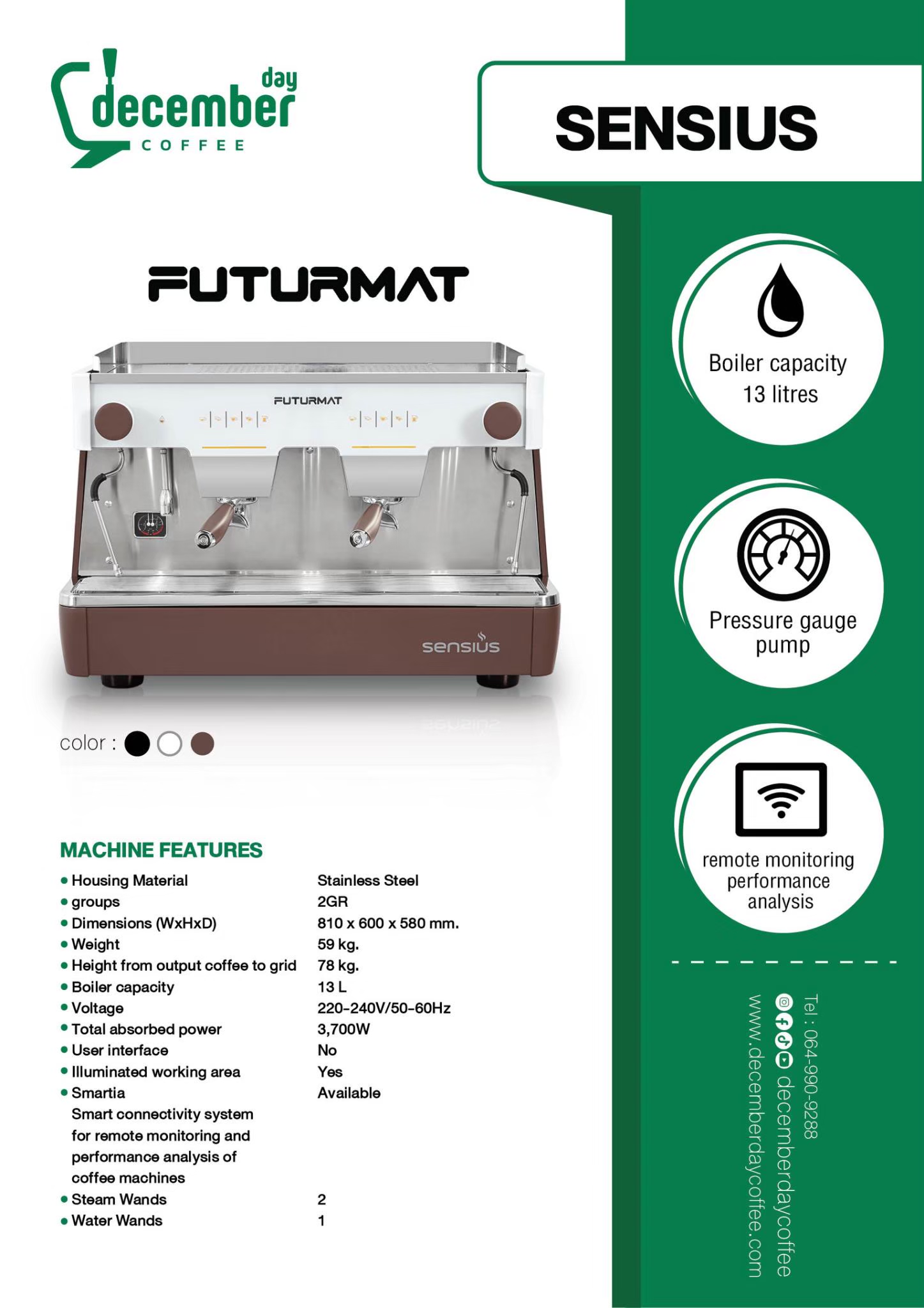 ที่สุดแห่งนวัตกรรมร้านกาแฟยุคใหม่ สู่ความสมบูรณ์แบบในทุกแก้ว! ยกระดับบาร์ของคุณด้วยชุดจับคู่ระดับท็อป Futurmat Sensius 2G เครื่องชงกาแฟพรีเมียมจากประเทศสเปน ที่มาพร้อมเทคโนโลยี Remote Monitoring Performance Analysis ให้คุณเช็คยอดสกัดช็อตและสถานะเครื่องได้ผ่านสมาร์ทโฟนหรือคอมพิวเตอร์แบบ Real-time ผสานกับหม้อต้มขนาด 7 ลิตรและ Economy Mode เพื่อการประหยัดพลังงานสูงสุด